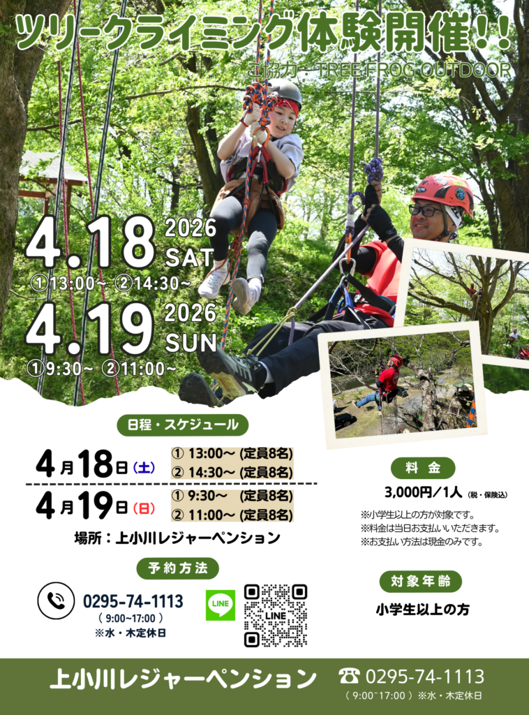 上小川レジャーペンションでツリークライミング体験を開催します‼️