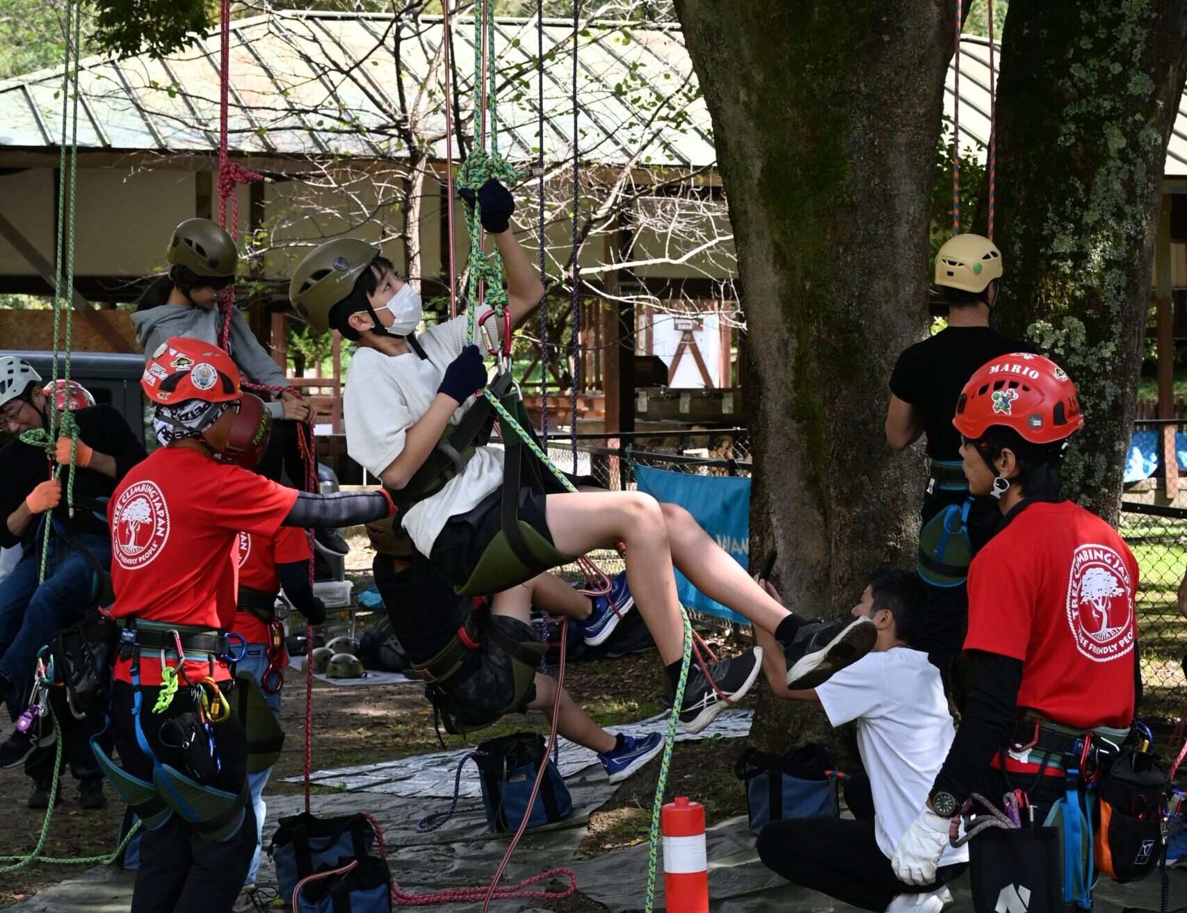 参加者はインストラクターから丁寧な指導を受けながら、自分のペースで木登りに挑戦。